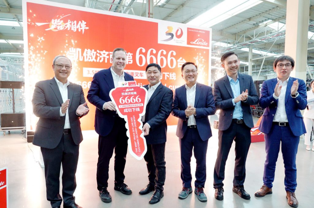 凱傲濟南工廠第6666臺林德電動平衡重叉車下線交付海爾集團,凱傲中國持續發力智能綠色搬運...