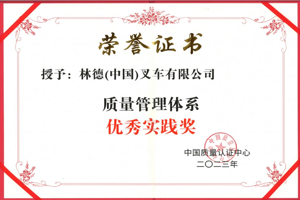 中國質量認證中心于2023年組織了全國范圍內首屆“質量管理體系優秀實踐獎“的評選,經過激烈的競爭,行業專家的評審,林德(中國)叉車有限公司從3萬多家單位中脫穎而出,榮獲的“2023年度質量管理體系優秀...